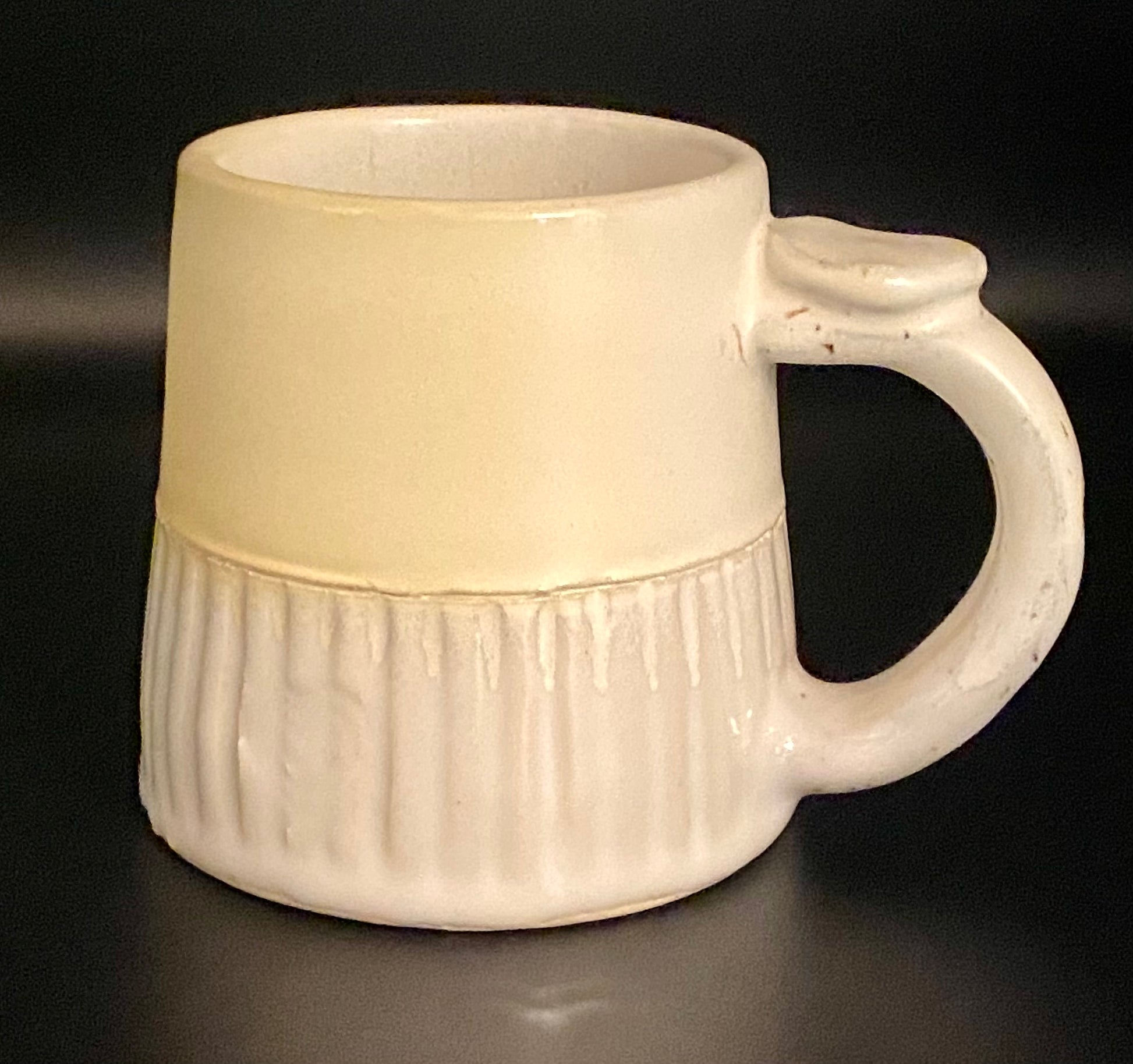 Pastel yellow mug with white textured bottom and thumb rest handle.